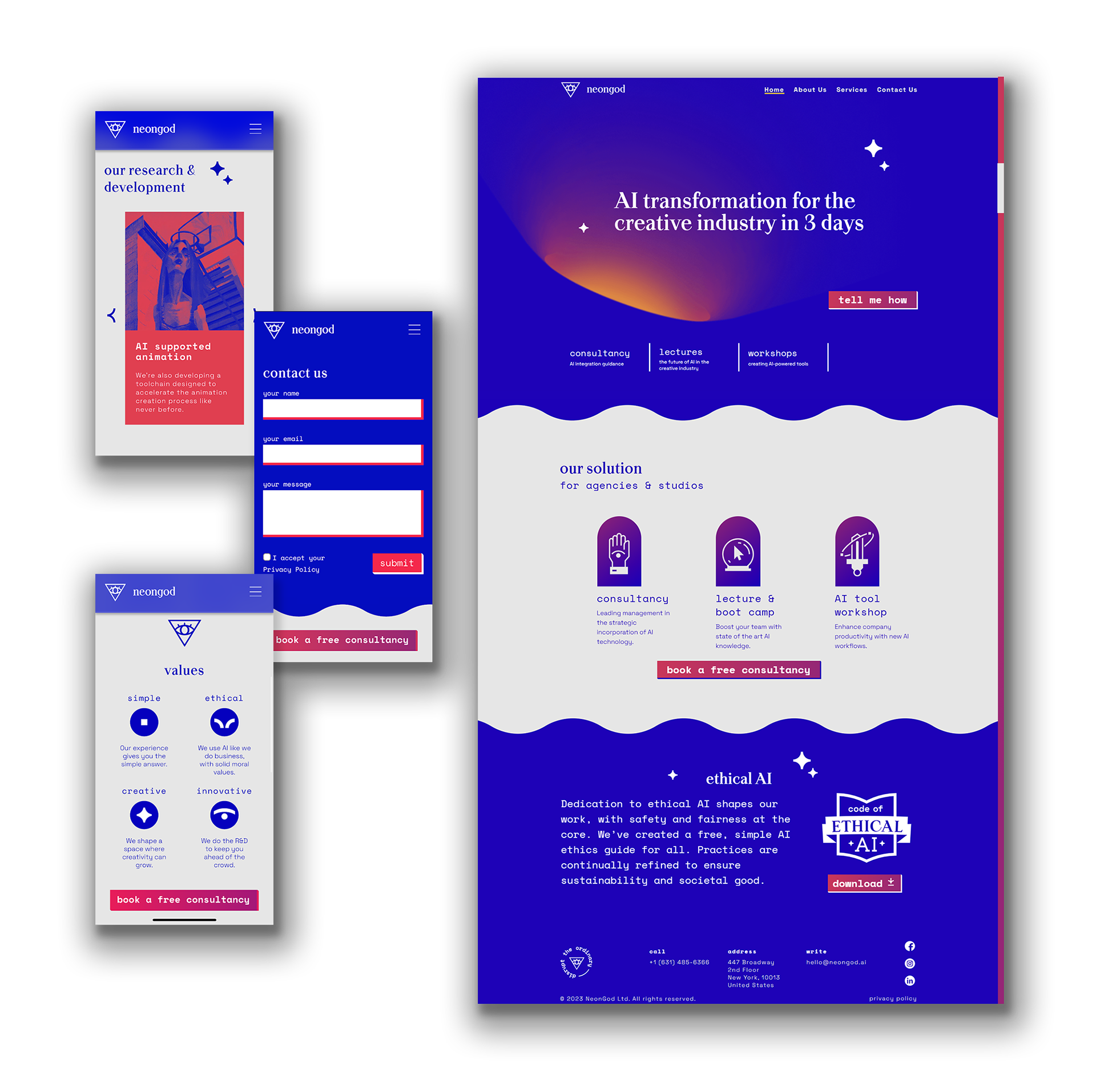 We crafted a clean and provocative brand identity for Neongod – an AI advising company blending the magical with the technical.